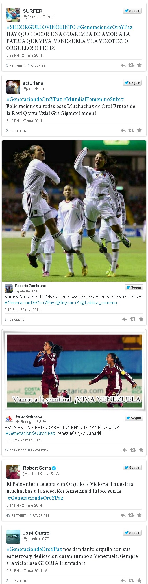 28 Mar. 2014 - Luego del impecable juego y victoria de la selección femenina de fútbol Sub-17 este jueves ante el equipo de Canadá, muchas han sido las manifestaciones de alegría y apoyo que los usuarios han mostrado a través de la red social Twitter.