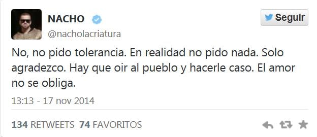 17-11-14.-El vocalista del dúo Chino y Nacho se pronunció nuevamente en la red social Twitter@nacholacriatura por los mensajes recibidos en los últimos días relacionados a su participación en el concierto Suena Caracas, organizado por la Alcaldía del municipio Libertador.