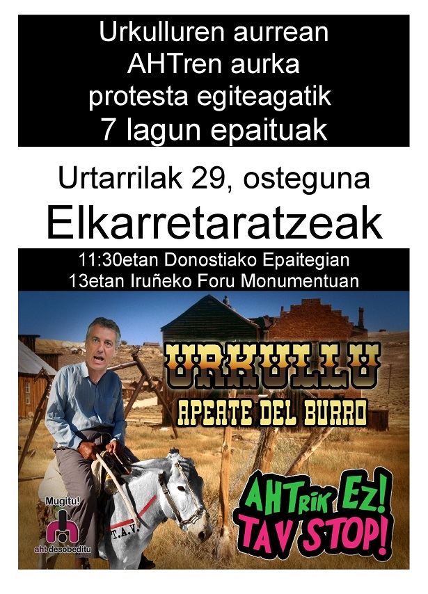Datorren ostegunean, urtarrilak 29, AHTren aurkako zazpi ekintzaile epaituko dituzte eguerdiko 12etan Donostiako Epaitegian, hain zuzen ere joan den azaroaren 5ean Urkullu lehendakariaren aurrean AHTren aurka protesta egiteagatik. Protesta hura Donostiako Kursaal jauregian egin zen, Eusko Jaurlaritzak “25 urte jasangarritasunaren alde” izenburupean eta Urkullu lehendakaria buru zela antolaturiko ekitaldian. Urkullu hizketan hasterakoan AHTri desobedientzia aldarrikatzen duen Mugitu! mugimenduko 7 lagun eszenatokira igo eta “AHT JASANGAITZA” eta “EAJ HIPOKRITAK” zioten kartelak erakutsi zituzten azpiegitura erraldoi honen aurka kantak eta aldarriak oihukatu zituzten bitartean.