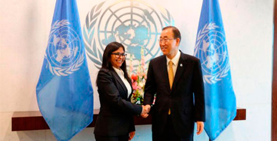 LA CANCILLER VENEZOLANA, DELCY RODRÍGUEZ, CON EL SECRETARIO GENERAL DE LA ORGANIZACIÓN DE LAS NACIONES UNIDAS (ONU), BAN KI-MOON