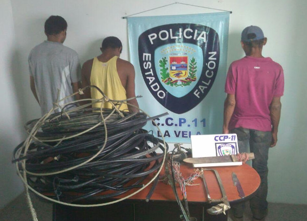 Entre el material incautado se encontró un tramo de un metro, de cableado interno de filtro ADL para líneas telefónicas, cuatro rollos de cable de aluminio forrados en material sintético color negro de unos 50 kg y 70 metros aproximadamente, usado por la empresa Cantv, así como un rollo mediano de material no ferroso, tipo guaya de 3 mts, con un peso de 6 kg, proveniente de la empresa Corpoelec y una segueta común, un objeto cortante tipo cuchillo sin empuñadura, un machete mediano, herramientas con las que presuntamente fueron realizados los cortes del cableado.