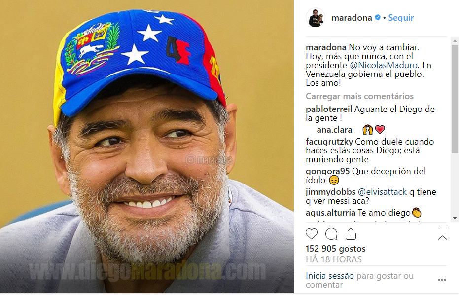 “No voy a cambiar. Hoy, más que nunca, con el presidente Nicolás Maduro“, dijo el exfutbolista argentino a través de su cuenta en la red social Instagram.
