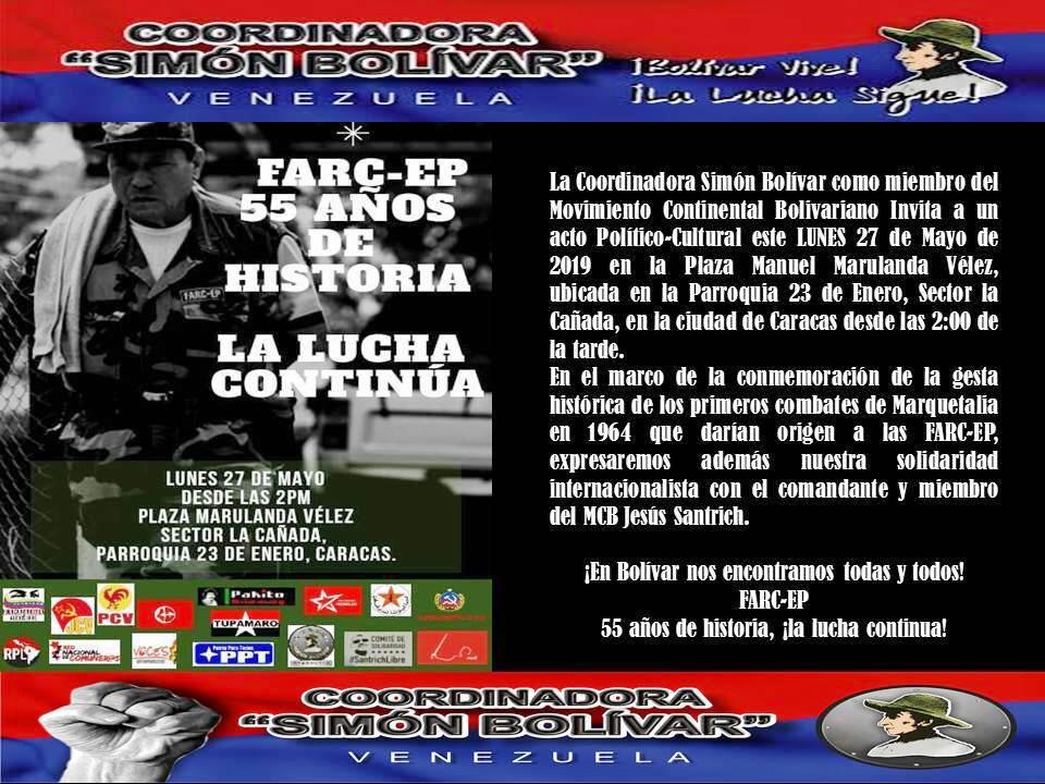 Reciban un cordial y revolucionario saludo en nombre de La Coordinador Simón Bolívar, a los 55 años del nacimiento de las FAR EP decimos con la rebeldía del marquetalia la lucha continua. Desde la selva colombiana aun escuchamos los gritos rebelde de Marulanda y los sueños de liberación inspirados en Carlos Marx y Simón Bolívar, hombres y mujeres, campesinos, obreros, estudiantes amas de casa, asumieron con todo el valor, convirtiéndose en la fuerza deliberante política y militar con más experiencia en el continente rescatar el surgimiento de las Fuerzas Armadas Revolucionaria de Colombia es contextualizar la lucha y las esperanzas del Movimiento Bolivariano Continental.