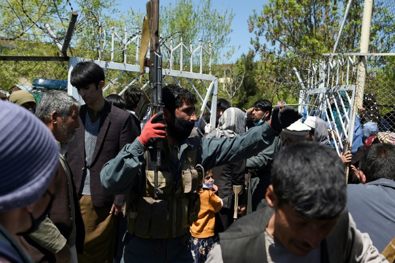 UN POLICÍA REGULA EL ORDEN DE LAS PERSONAS QUE ESPERAN EL 21 DE ABRIL DE 2020 EN KABUL PARA RECIBIR TRIGO GRATIS DEL COMITÉ DE EMERGENCIAS DEL GOBIERNO DURANTE EL CONFINAMIENTO IMPUESTO EN LA CAPITAL AFGANA COMO MEDIDA CONTRA EL CORONAVIRUS