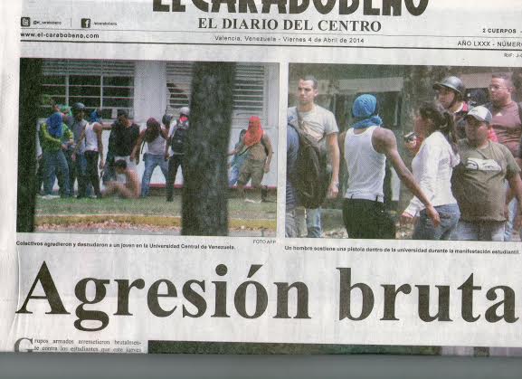 5 de abril de 2014.-El diario El Carabobeño de Valencia, no conforme con la vejación a la que se sometió al joven estudiante de la Escuela de Trabajo Social de la UCV William Muñoz, está acusando a nuestros colectivos de ser los responsables del acto terrorista y oprobioso de golpearlo brutalmente, desnudarlo y echarle gasolina amenazándolo con prenderlo fuego.
