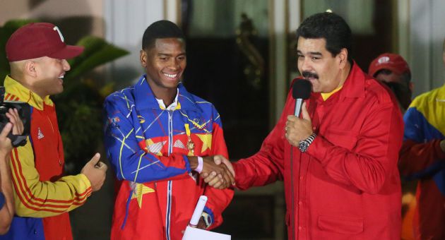 Caracas, octubre 7 - El presidente de la República, Nicolás Maduro, condecoró con la Orden Francisco de Miranda al atleta venezolano Marvin Blanco, quien el pasado domingo se alzó con el primer lugar de la carrera Caracas Rock, o maratón Gatorate portando un afiche del diputado socialista Robert Serra.