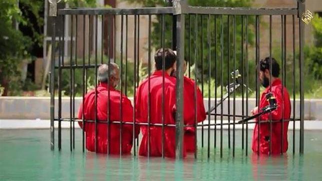 Uno por uno, los detenidos confiesan los delitos de los que le acusa el EI ante la cámara, después empiezan los asesinatos. Un encapuchado sube a los cuatro primeros presos esposados a un coche en mitad del desierto. Cierra las puertas. Se aleja unos metros y dispara un lanzacohetes. El vehículo se convierte en una bola de fuego en medio de gritos del dolor. Otros cinco hombres con buzos naranjas son introducidos en una gran jaula –similar a la del piloto jordano que fue quemado vivo- que una grúa baja lentamente en mitad de una piscina. Cámaras acuáticas captan la agonía final de cada uno de los hombres. Los últimos seis prisioneros son conducidos a un lugar en el desierto en el que les ponen collares de explosivos que el EI activa al mismo tiempo. Algunas cabezas salen disparadas y otros cuerpos sufren horribles mutilaciones que las cámaras recogen durante interminables segundos.