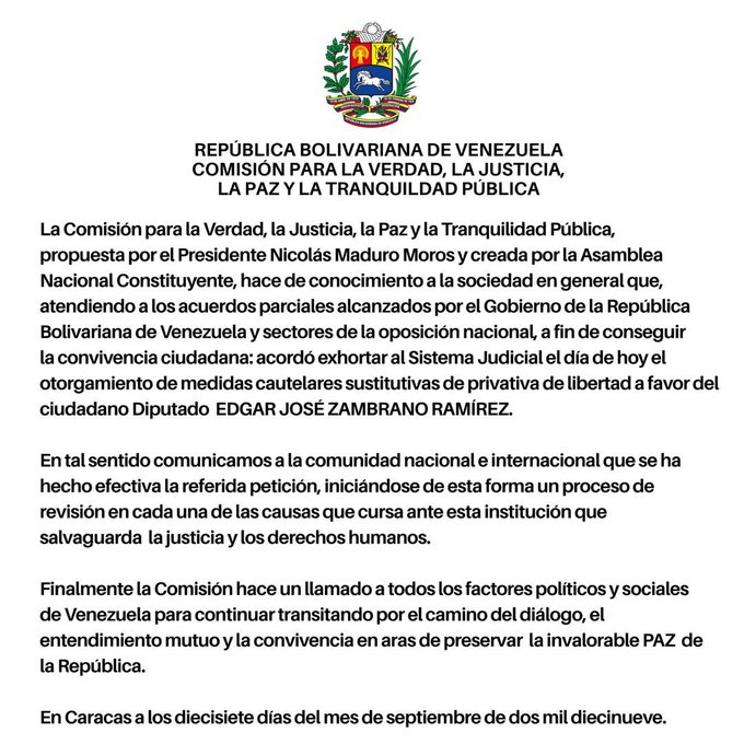 #COMUNICADO de la Comisión para la Verdad, la Justicia, la Paz y la Tranquilidad Pública en relación a la solicitud de revisión de medida cautelar sustitutiva de privativa de libertad otorgada a favor del Diputado EDGAR JOSÉ ZAMBRANO RAMIREZ